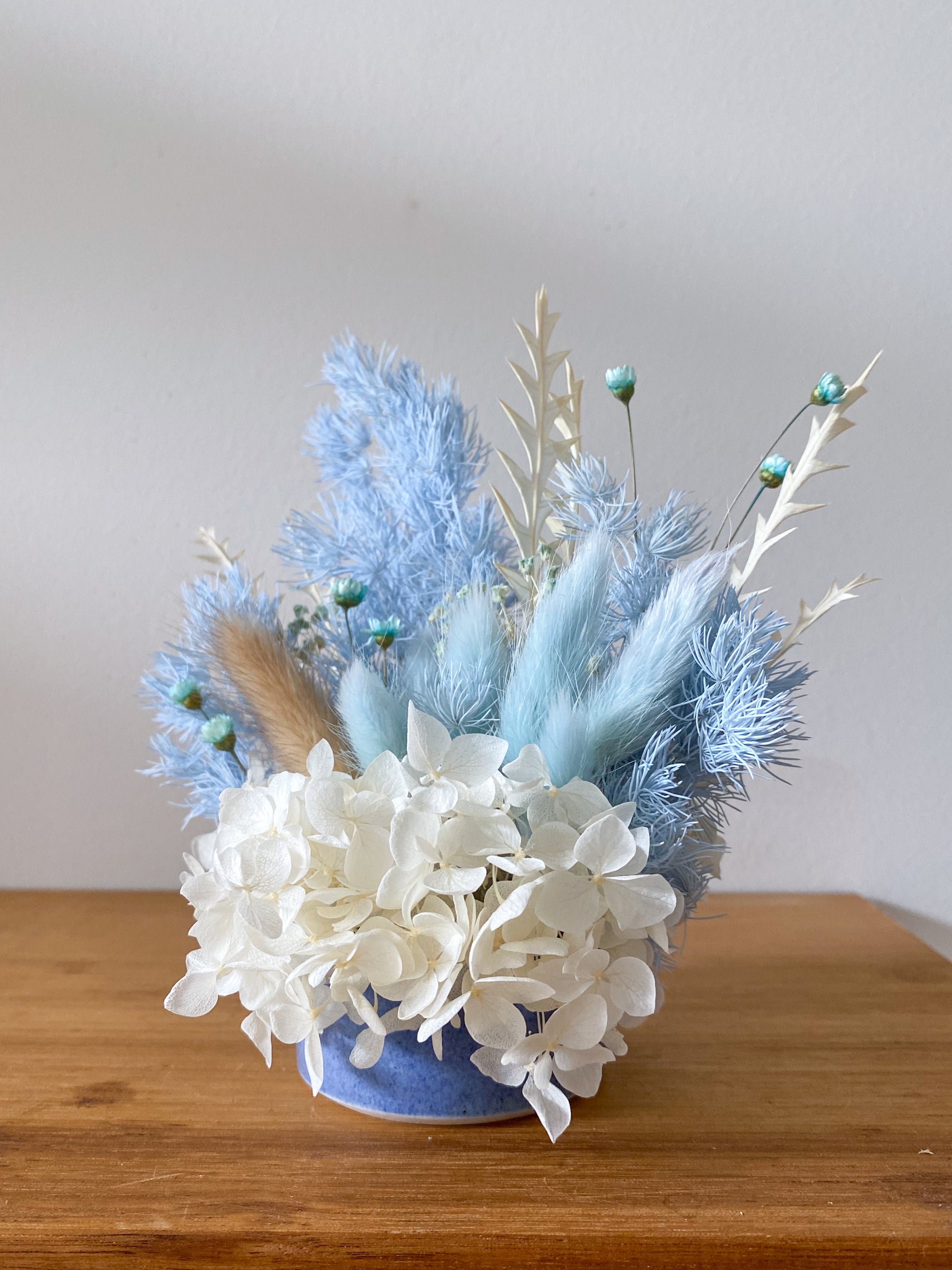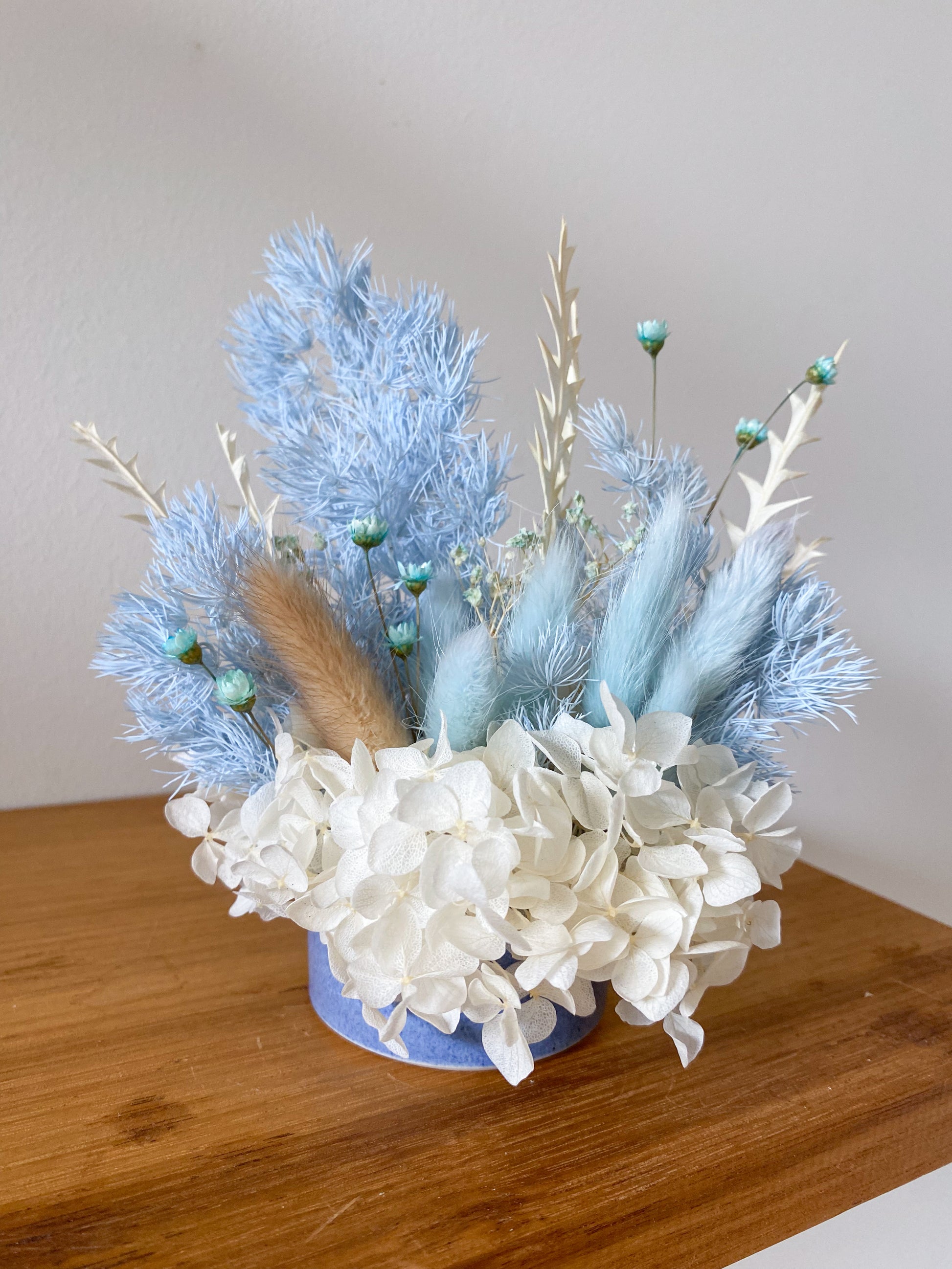 A small pot of blue-toned everlasting flowers. Designed to last, this is a stunning piece of decor for a shelf at home or front counter at your business!