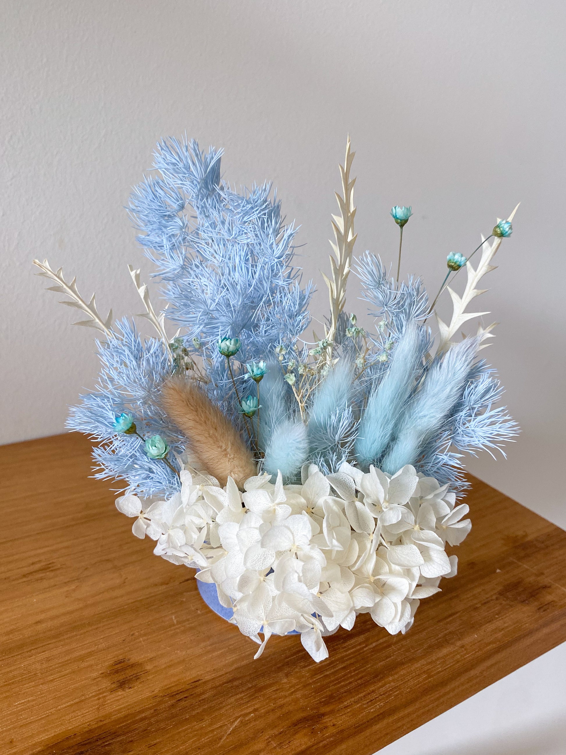 Featuring a creamy hydrangea and ice blue ming fern, this statement piece is perfect as a gift for a friend or a treat for yourself!