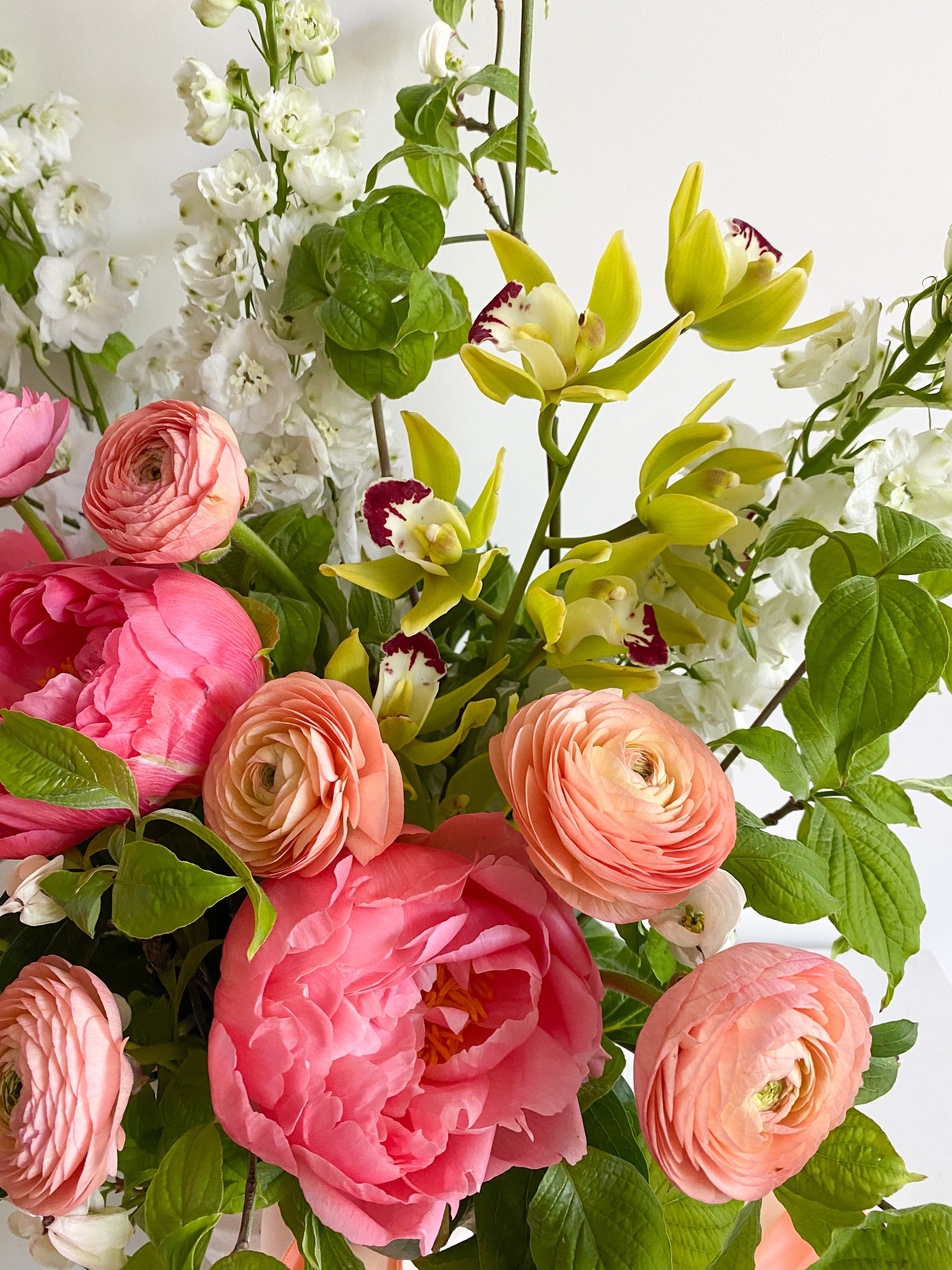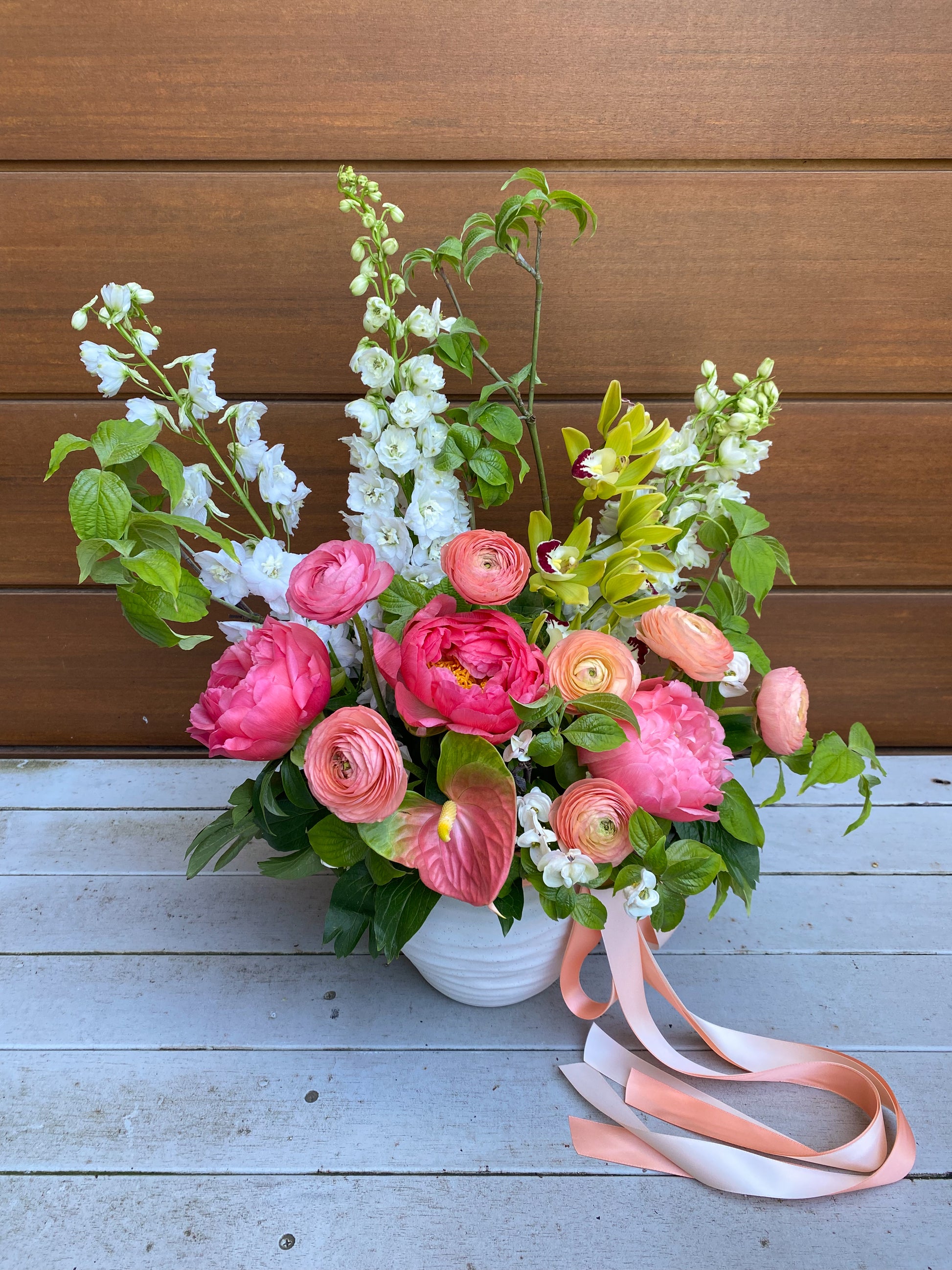 Either wrapped in kraft white and brown paper with deluxe satin ribbon, and delivered wrapped in hidden water to ensure freshness, or arranged in a vase without floral foam, delivered in water to keep your blooms fresh!