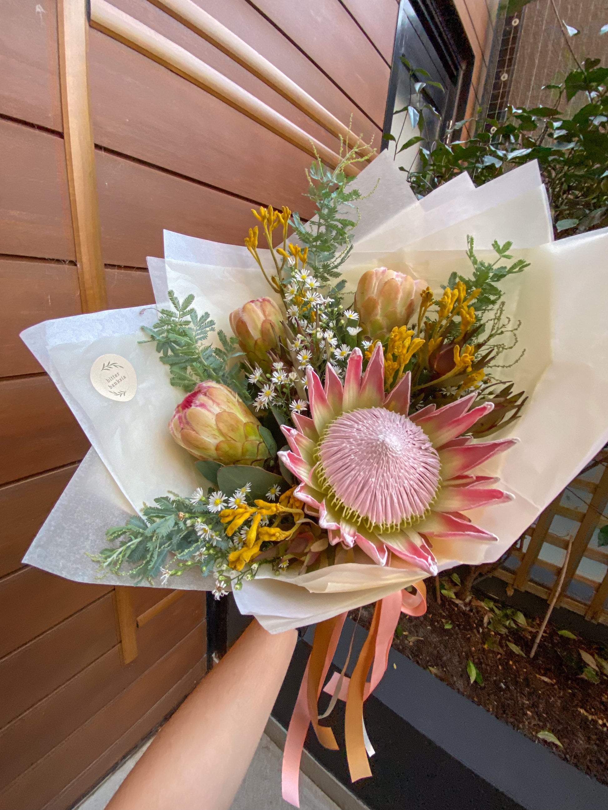An arrangement of seasonal native blooms. Either wrapped in kraft white paper with deluxe satin ribbon, and delivered wrapped in hidden water to ensure freshness, or arranged in a vase without floral foam, delivered in water to keep your blooms fresh!
