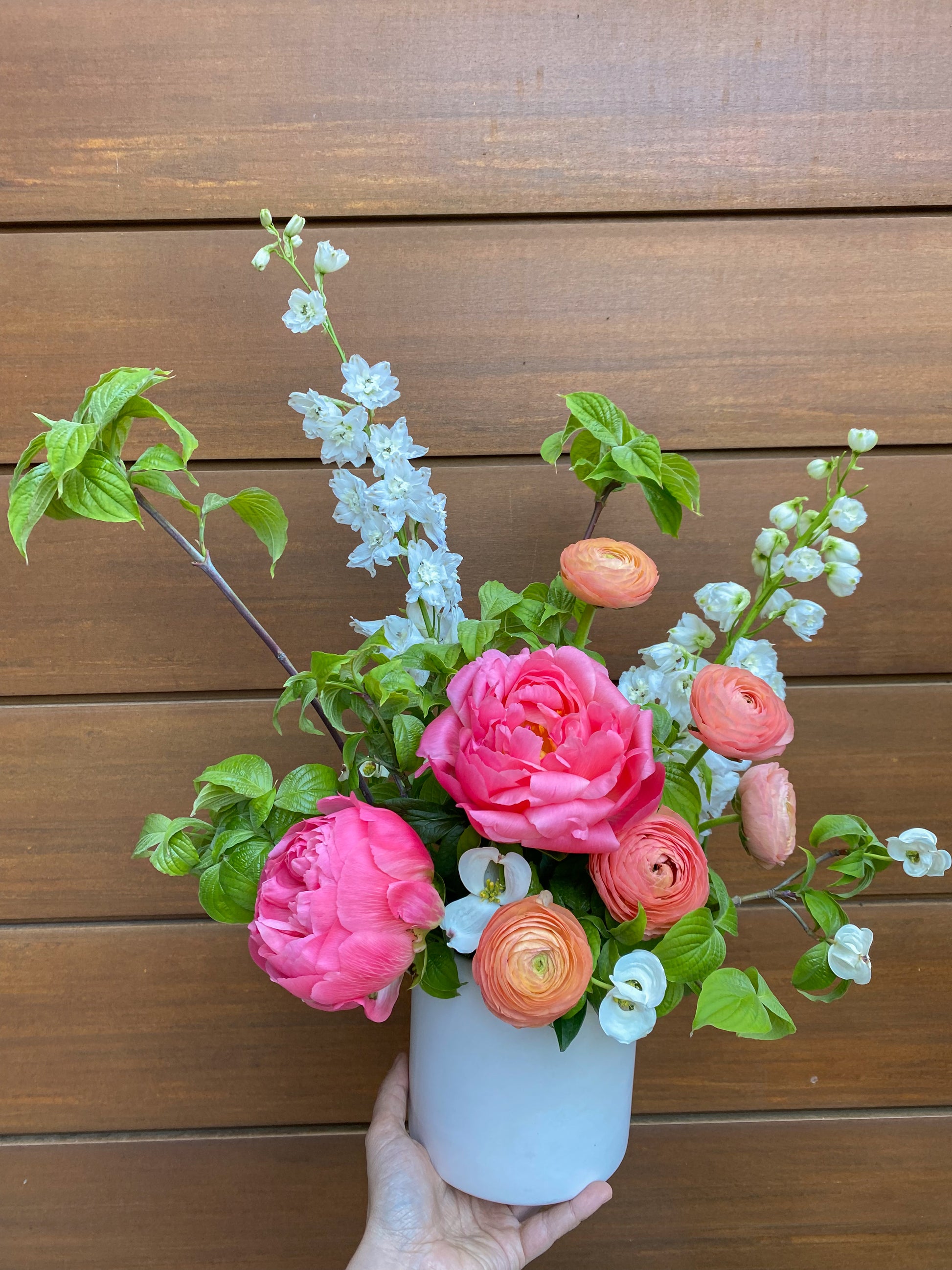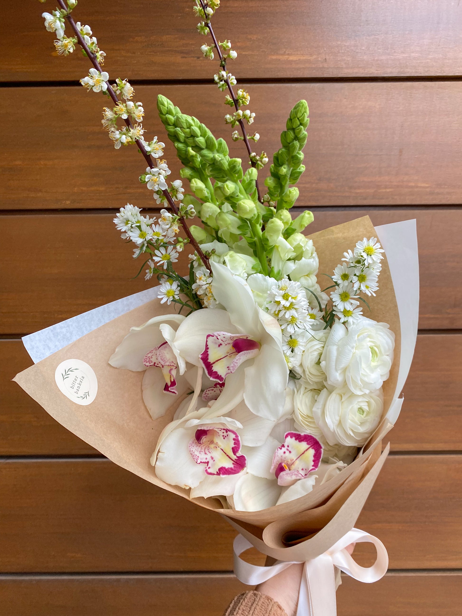 Either wrapped in kraft white and brown paper with deluxe satin ribbon, and delivered wrapped in hidden water to ensure freshness, or arranged in a vase without floral foam, delivered in water to keep your blooms fresh!