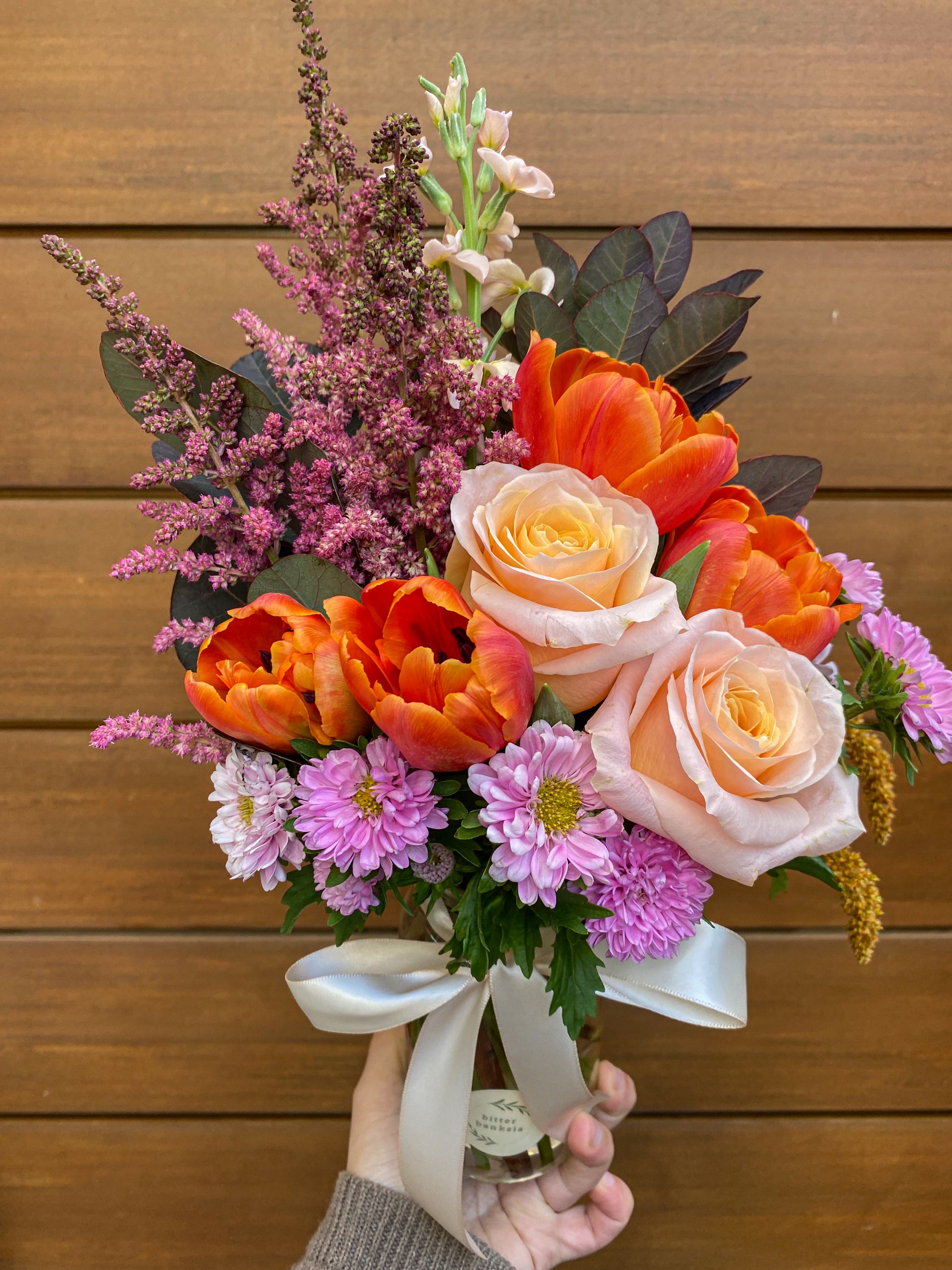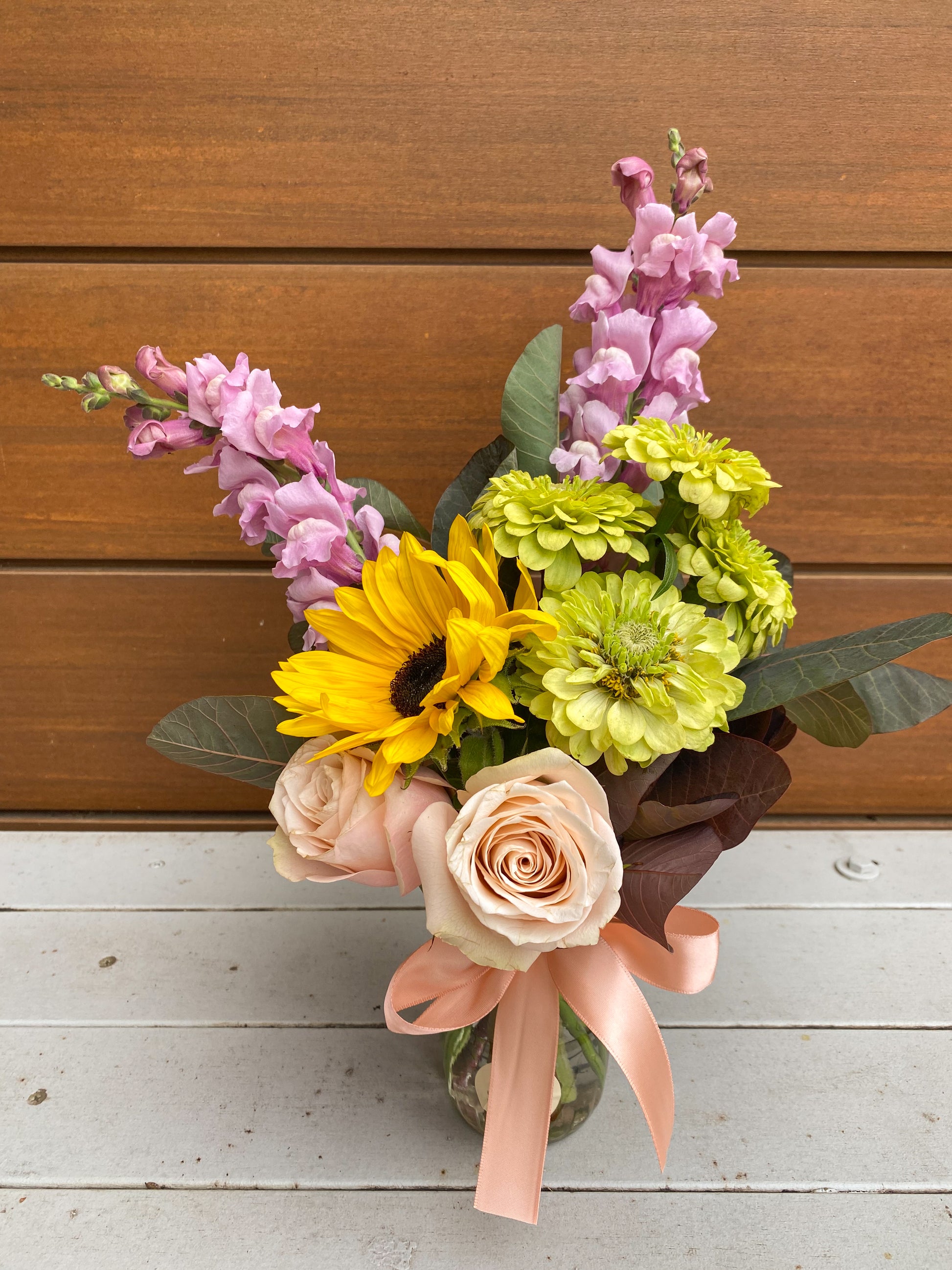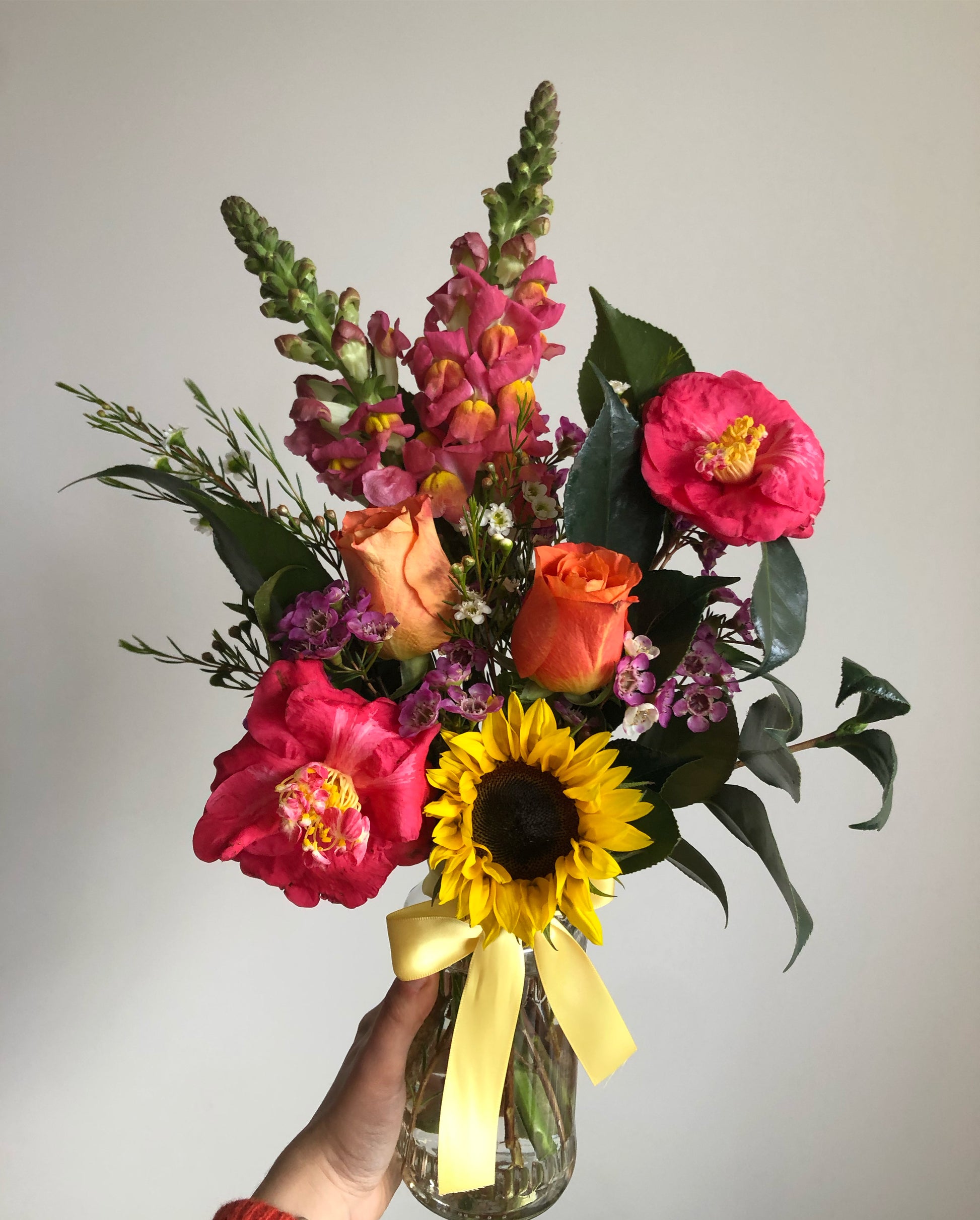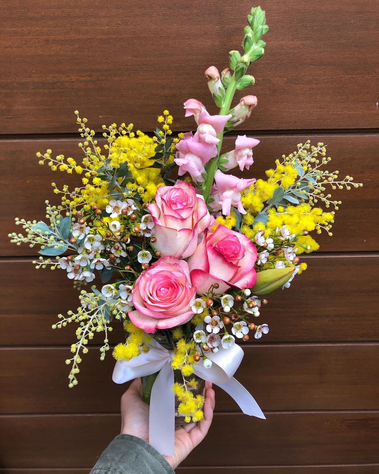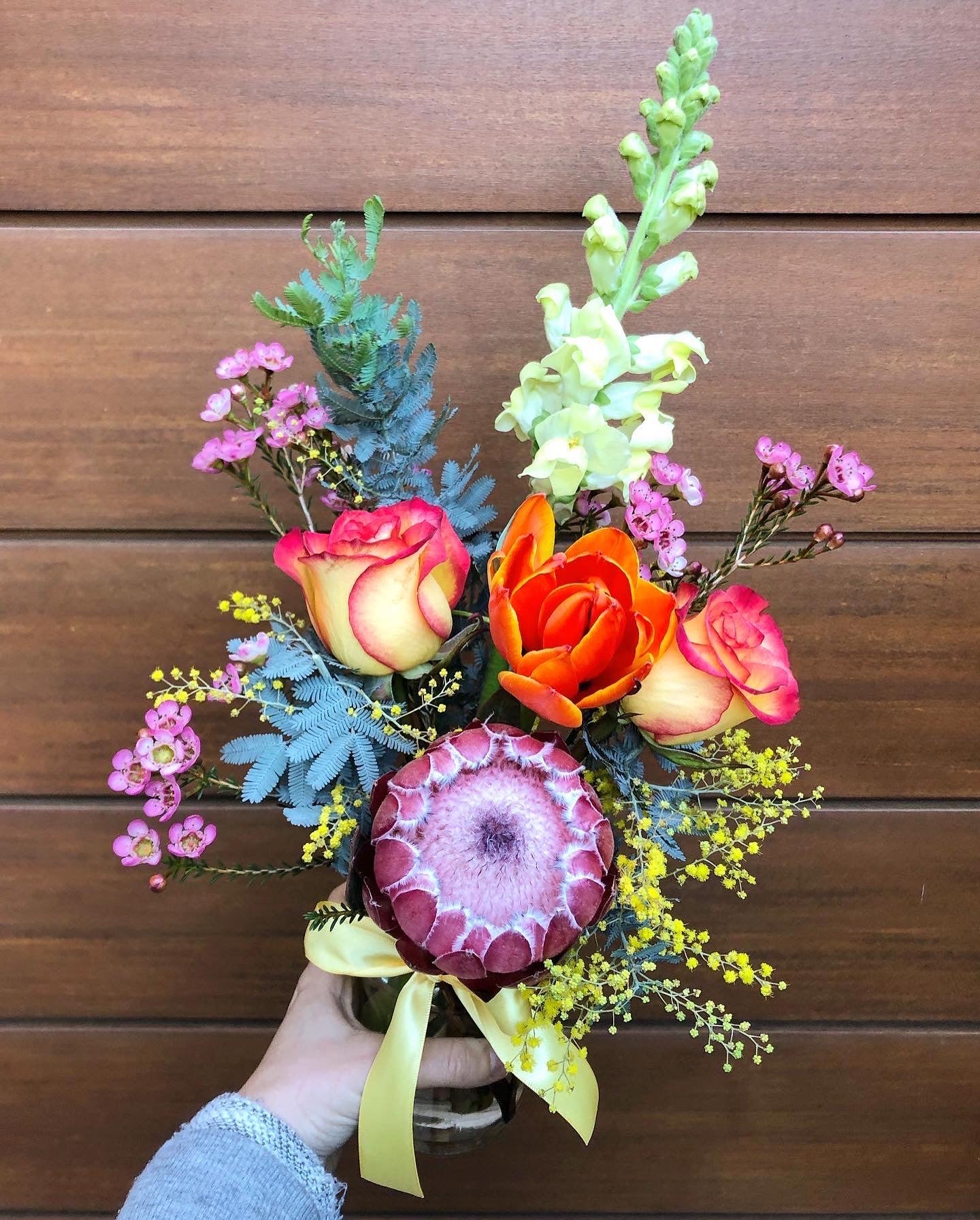 A jar full of fresh flowers in water, smaller than a bouquet but still packs a big impact. Delivered in a jar of fresh water and finished with a satin ribbon.