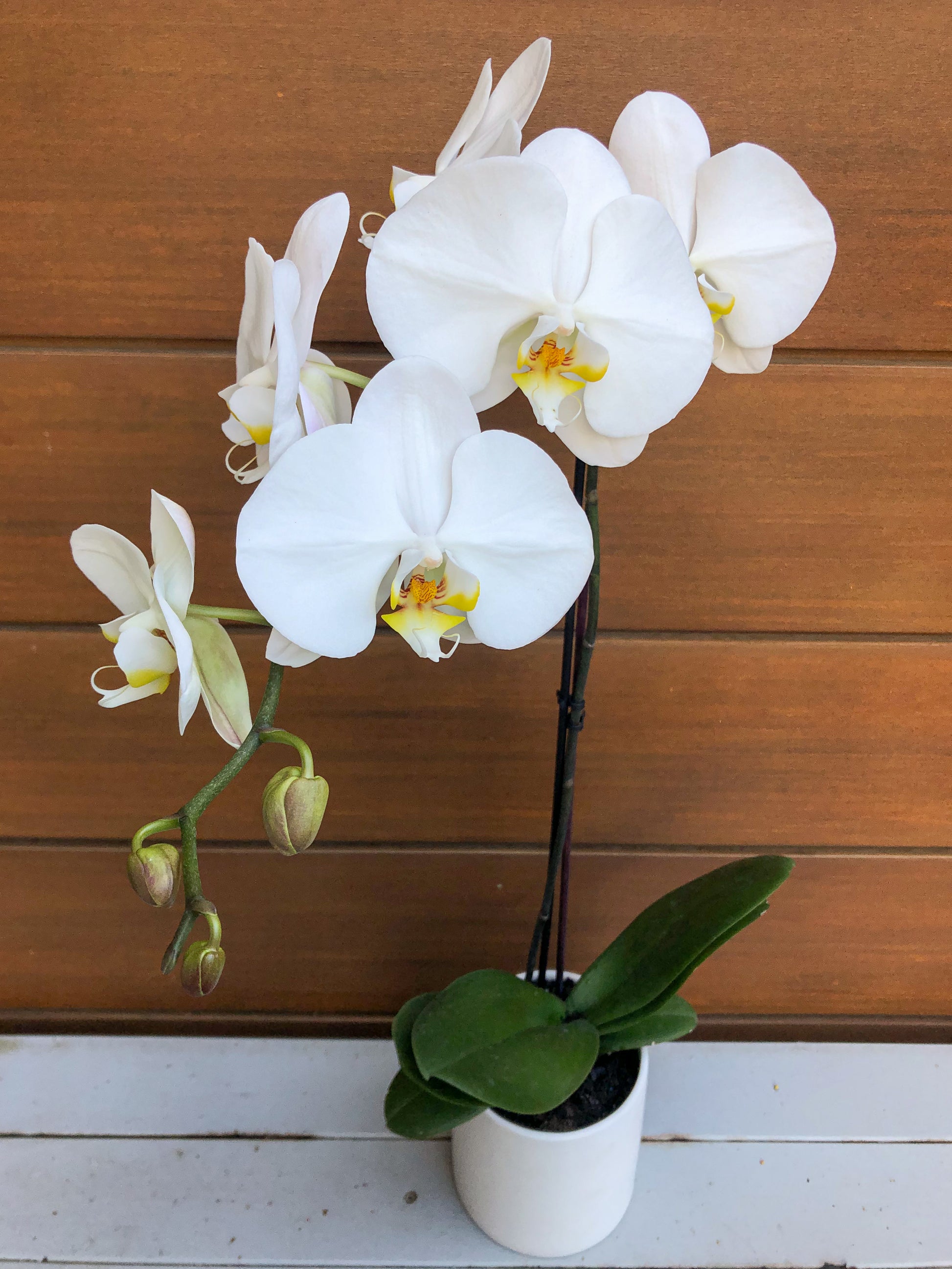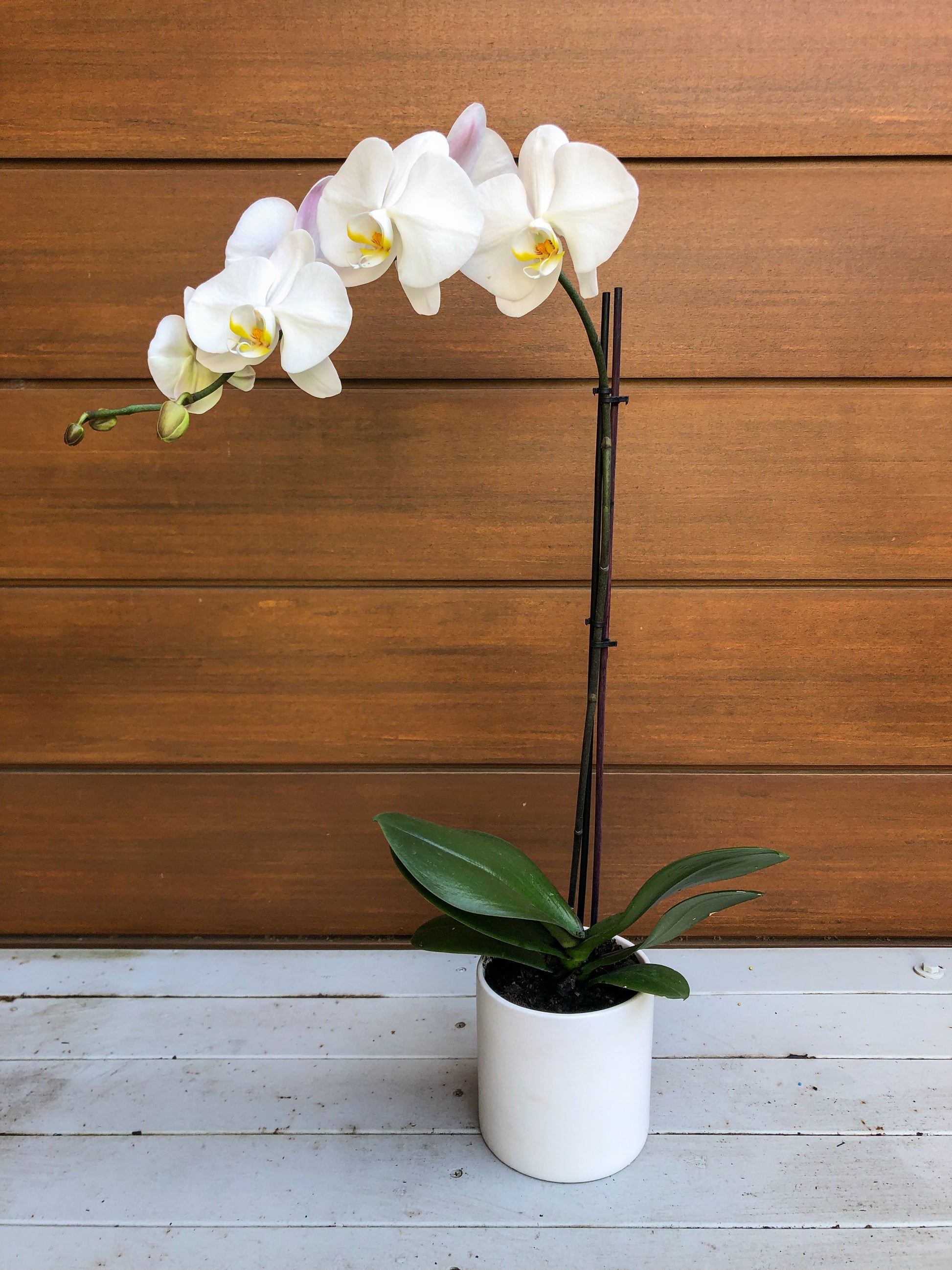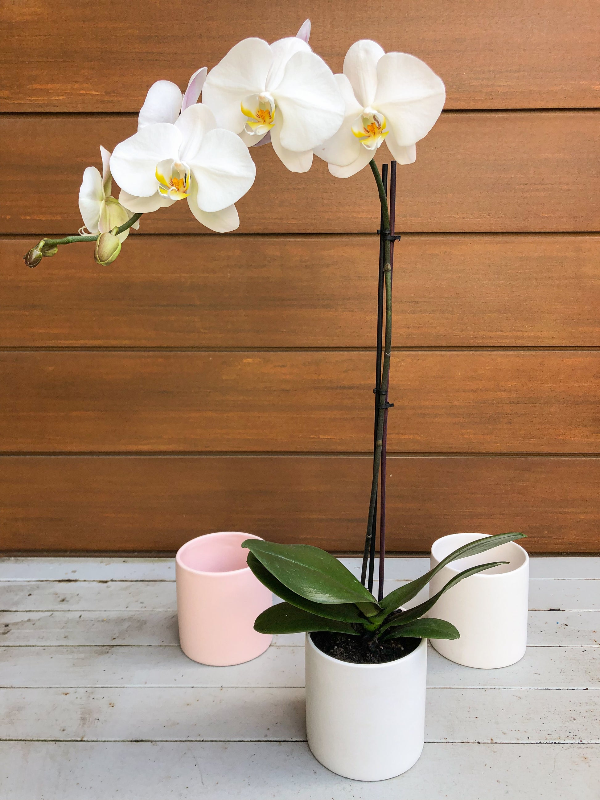 A fresh white phalenopsis orchid, potted into a ceramic pot in your choice of pink or white, is the perfect gift to give fresh flowers that last longer than a bouquet! These orchids are cat friendly, to give feline owners peace of mind.